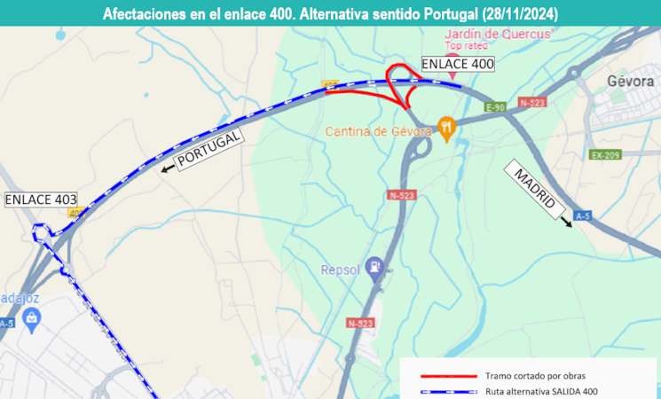 En concreto, en la calzada sentido Portugal, se realizará el cierre de la salida 400 hacia N-523 Badajoz/Cáceres, por lo que se propone como alternativa la salida del enlace 403 Badajoz, por lo que se deberá tomar la carretera Campomaior sentido Badajoz, avenida Padre Tacoronte y finalmente calle de Inés Medrano Gil.