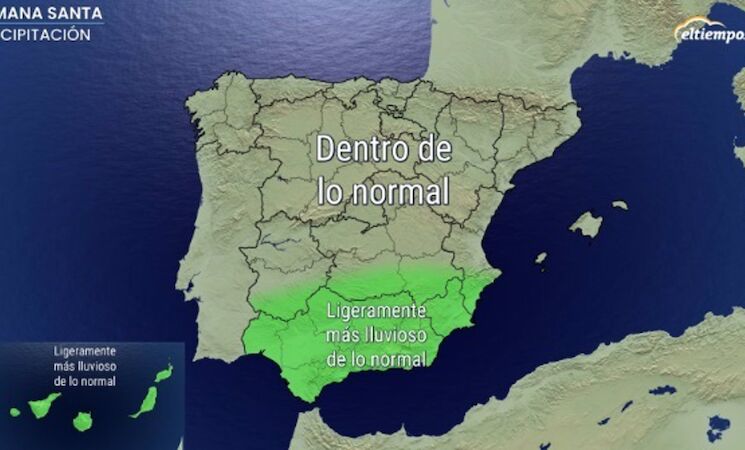 Eltiempo.es ha avanzado que Canarias, Andalucía, Región de Murcia y en el sur de Castilla-La Mancha, de Extremadura y de la Comunidad Valenciana registrarán una Semana Santa "ligeramente más lluviosa de lo habitual". Además, ha señalado que las temperaturas se mantendrán dentro de lo normal excepto por Baleares y Canarias, donde podrían ser "ligeramente superiores".