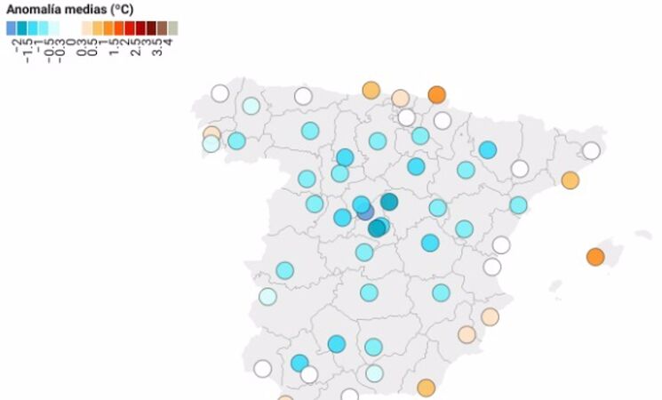 Otras áreas, como Soria, Segovia o Huesca, han experimentado temperaturas hasta -1,5ºC por debajo de lo que sería normal. Fuera de aquí, las anomalías han estado entre -0,5ºC y -1,5ºC en Extremadura, Andalucía, Castilla-La Mancha, Castilla y León, La Rioja o Aragón. Sin embargo, en puntos del País Vasco y Baleares ha sido un mes cálido. De hecho, San Sebastián ha presentado una anomalía de +1,3ºC. Mientras, Palma ha tenido una temperatura media de 15,2ºC, lo que supone 1,4ºC más que la media.