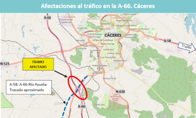 El Ministerio de Transportes y Movilidad Sostenible está ejecutando las obras de construcción del primer tramo entre Cáceres y el río Ayuela que formará parte de la A-58, una autovía que conecta actualmente el municipio de Trujillo con Cáceres y cuya prolongación hacia el suroeste permitirá la conexión de estos dos municipios con Badajoz.