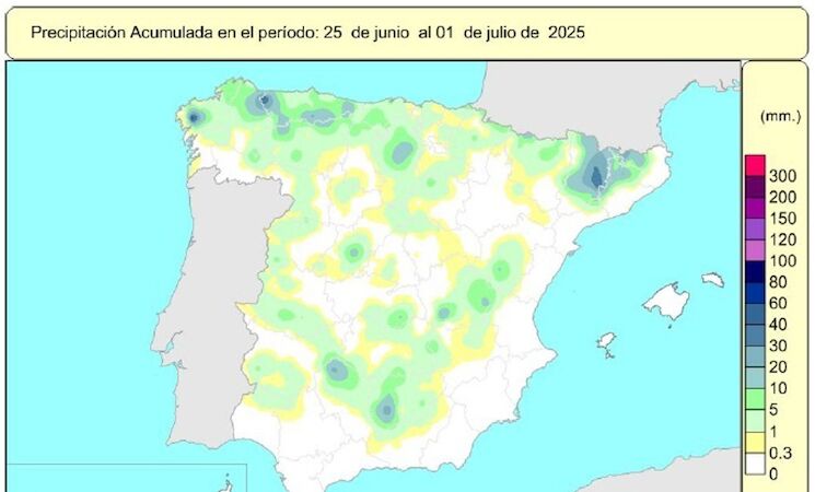 Durante el periodo del 25 de junio al 1 de julio las precipitaciones fueron dispersas y afectaron principalmente al tercio norte y al interior de la Península. Tanto en Baleares como en Canarias fueron escasas. Por zonas, se superaron los 10 l/m2 en puntos de Galicia y Asturias, en la mitad oeste de Cataluña y de manera más aislada en los Sistemas Central e Ibérico, en la provincia de Cuenca y en puntos del norte de Andalucía.
