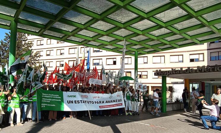 Trabajadores sanitarios se han manifestado este martes en el Hospital de Mérida para reclamar al Ministerio de Sanidad que no cierre la negociación de la Ley que establece sus condiciones laborales y acuerde un Estatuto Marco para avanzar que beneficie a todo el personal de la sanidad pública y a sus pacientes.