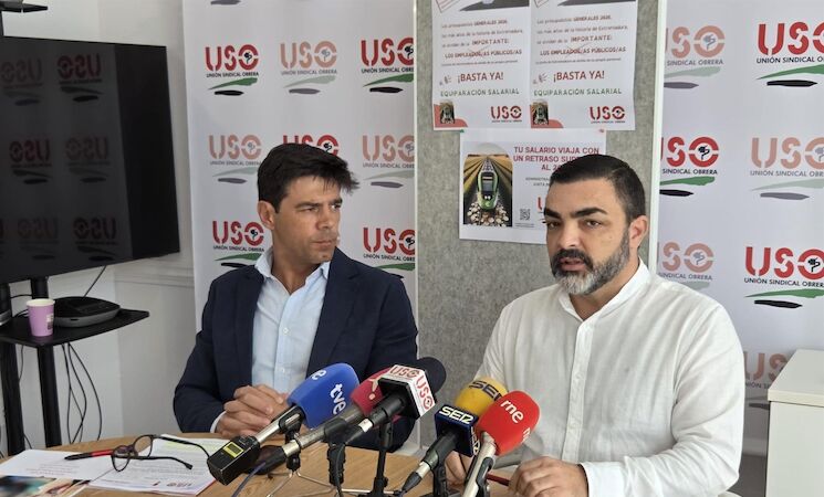 El secretario general de USO a nivel confederal, Joaquín Pérez, y en Extremadura, Luis Manuel Gil, han ofrecido este martes una rueda de prensa en la que han expuesto que los PGEx para 2026 no incluyen "ni un solo euro" destinado a la equiparación salarial del personal de la Administración General y que, en cambio, sí recogen una partida de 23 millones de euros para la subida salarial de los docentes en lo que califican como una medida "positiva", pero que aumenta la brecha entre colectivos dentro de la propia Junta.