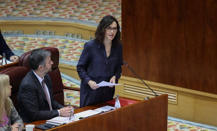 Isabel Díaz Ayuso ha ironizado con que Vox está "comprando las pancartas de segunda manos" en las "mismas tiendas que la izquierda", mientras que el Ejecutivo regional está "peleando con uñas y dientes, solos" los "ataques" del Gobierno central en materia de energía, sanidad, Formación Profesional o con la promoción de "una lucha de clases que no es propia en Madrid".