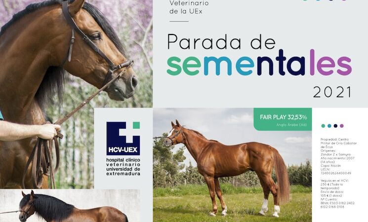 Un año más, el Hospital Clínico Veterinario de la Universidad de Extremadura (UEx) pone a disposición su servicio de parada de sementales, dirigido a ganaderos y veterinarios, que en esta ocasión consta de cuatro ejemplares, tres provenientes del Centro Militar de Cría Caballar de Écija (un PRE, un Anglo-árabe y un CDE) y otro Hannoveriano propiedad de un ganadero particular.