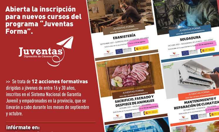 El programa Juventas Forma de la Diputación de Cáceres ha abierto el plazo de inscripción para participar en 12 nuevos cursos, dirigidos a jóvenes de entre 16 y 30 años, que se llevarán a cabo durante los meses de septiembre y octubre.