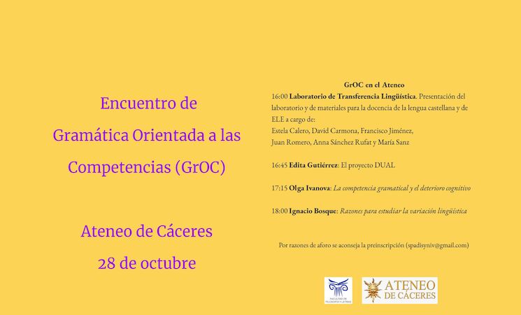 En concreto, este es el objetivo del 'Encuentro de Gramática Orientada a la Competencia' que se celebrará en el Ateneo de Cáceres el 28 de octubre con la participación del lingüista español Ignacio Bosque, una actividad que se complementa con la presentación del Laboratorio de Transferencia Lingüística en la Facultad de Filosofía y Letras.