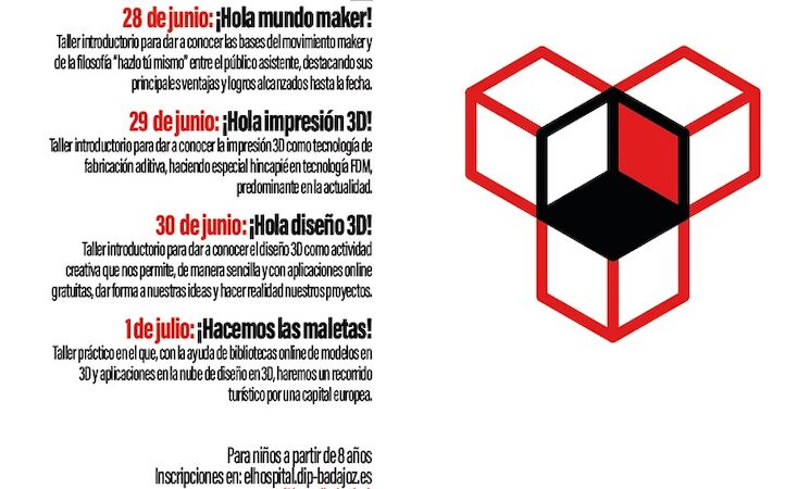 Ya el 29 junio se impartirá el taller '¡Hola impresión 3D!', para dar a conocer la impresión 3D como tecnología de fabricación aditiva, haciendo especial hincapié en tecnología FDM, predominante en la actualidad, y el día 30 de junio será '¡Hola diseño 3D!', que abordará este diseño como actividad creativa que "permite, de manera sencilla y con aplicaciones online gratuitas, dar forma a nuestras ideas y hacer realidad nuestros proyectos".