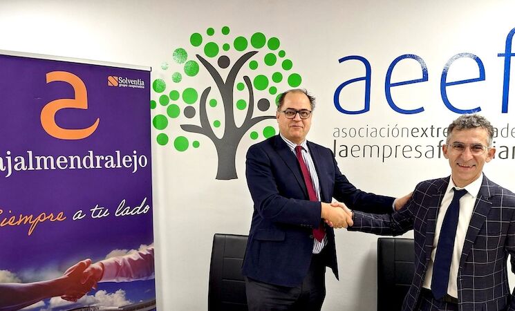 La Asociación Extremeña de la Empresa Familiar, AEEF, y Cajalmendralejo han firmado un acuerdo de colaboración mediante el cual ambas organizaciones se comprometen a organizar conjuntamente actividades e iniciativas, estrechar sus relaciones y aunar esfuerzos para contribuir al fortalecimiento del tejido empresarial de la región y, especialmente, a la continuidad de la empresa familiar extremeña.