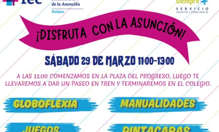 Docentes del Colegio FEC Nuestra Señora de la Asunción de Badajoz celebrarán durante este sábado, 29 de marzo, a partir de las 11:00 horas actividades de ocio para niños de las barriadas al norte de las vías y para quienes quieran acercarse a compartir un rato de convivencia en un ambiente festivo a la vez que educativo que incluyen, entre otras, un trenecito infantil por el barrio.