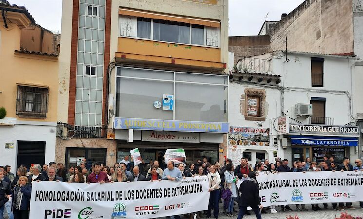 Alrededor de un centenar de personas se han concentrado este miércoles, día 30, frente a las puertas de Presidencia de la Junta de Extremadura, en Mérida, para reclamar a la Consejería de Educación que responda a la propuesta de homologación salarial planteada por los sindicatos.