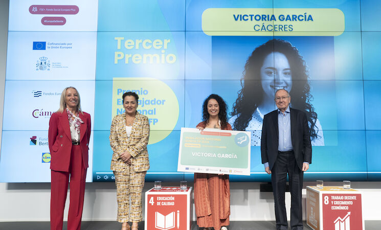 La Cámara de Comercio de España, la Fundación Bertelsmann y Lidl Supermercados, con el apoyo del Fondo Social Europeo Plus, han elegido a Victoria García tercera ganadora del premio Embajador Nacional del Año de la red Somos FP que concede la Cámara de Comercio de España, la Fundación Bertelsmann y Lidl Supermercados, con el apoyo del Fondo Social Europeo Plus.