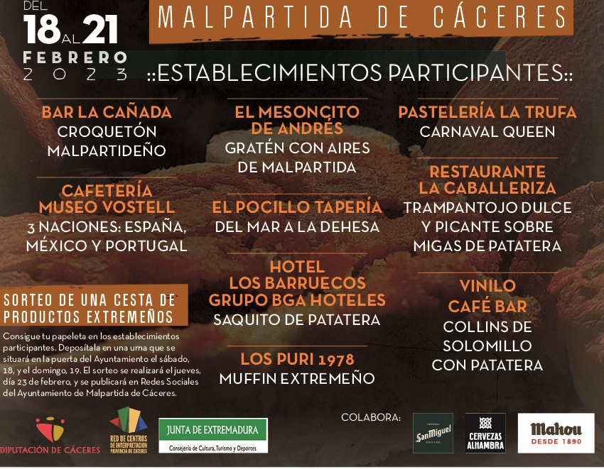 Con motivo de la celebración de la Fiesta de la Pedida de la Patatera el próximo 21 de febrero, en Malpartida de Cáceres, el consistorio ha organizado las jornadas gastronómicas XI Ruta de la Tapa de la Patatera.