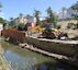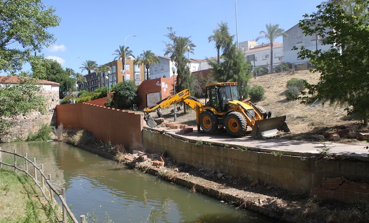 Los trabajos necesarios para ejecutar la reposición del muro de fábrica de ladrillo en el paseo junto al edificio del antiguo "Molino de Pan Caliente" de Mérida han comenzado este viernes, 14 de junio, tras el derrumbe sufrido hace unas semanas.