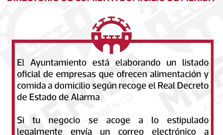 El Ayuntamiento de Mérida elaborará un listado oficial de empresas que repartan alimentación y comidas a domicilio para proporcionar a los ciudadanos, de manera unificada, herramientas para que puedan permanecer en sus domicilios y que les faciliten sus compras de primera necesidad.