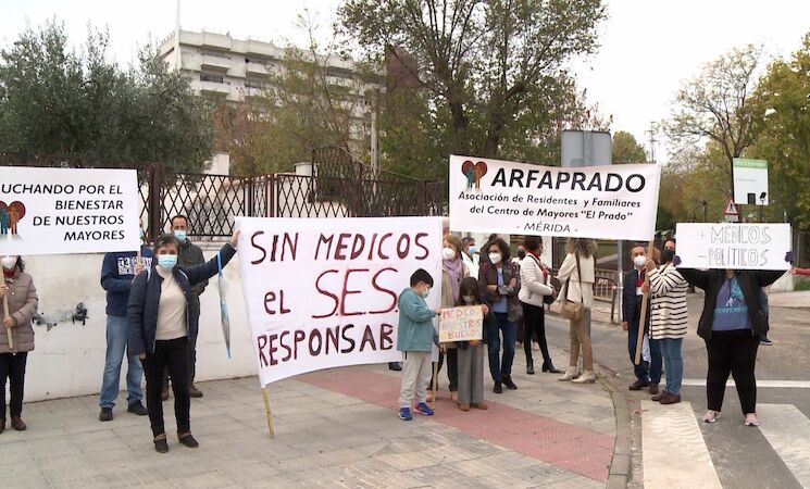 Familiares de los residentes en la Residencia de Mayores 'El Prado' de Mérida se han concentrado la tarde de este viernes frente a la puerta de este centro para reclamar al Servicio Extremeño de Salud (SES) que cubra las plazas de médicos en este centro residencial.