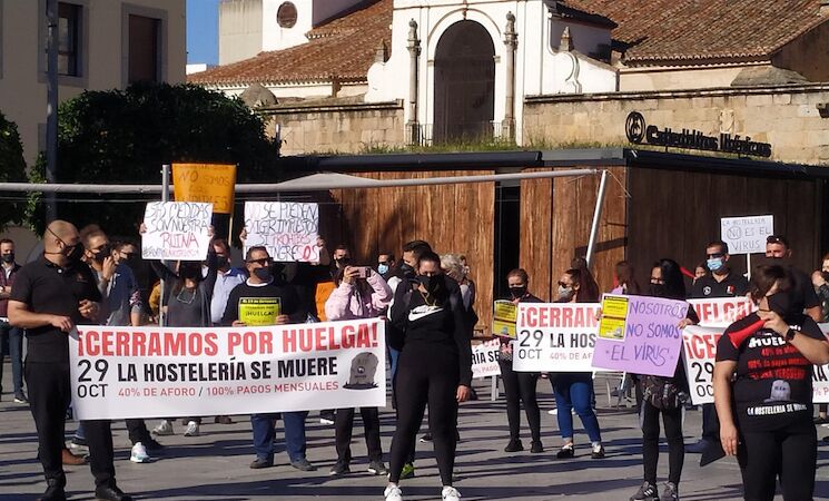 Más de un centenar de hosteleros de Mérida se han manifestado este miércoles en la Plaza de España de la capital extremeña para reclamar indemnizaciones por las pérdidas ocasionadas por el cierre de sus negocios dentro de las restricciones para frenar la expansión del coronavirus, así como un plan de reapertura "claro" que les permita planificar con garantías de viabilidad la vuelta a la actividad.