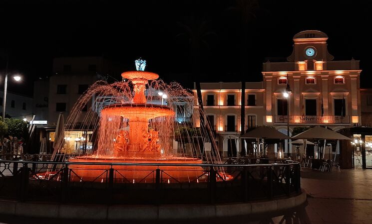 La fachada del Ayuntamiento de Mérida se ilumina este miércoles, 28 de abril, de color verde, y en color naranja la fuente de la Plaza de España, la Plaza de las Méridas del Mundo y el Puente Romano, a petición de la Asociación Extremeña de Fibrosis Quística, con motivo del Día Nacional de esta enfermedad.