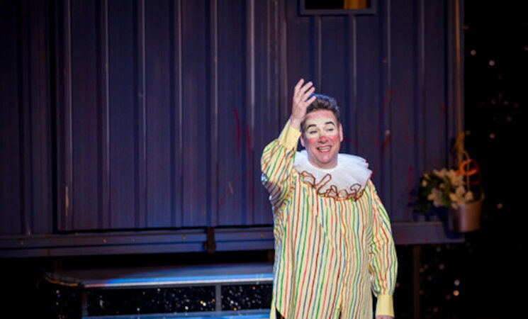 ¿Cómo se encuentra ataviado de payaso en la escenografía circense de este musical?