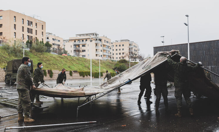 Efectivos de Ejército de Tierra están instalando carpas en la Institución Ferial de Mérida (Ifeme) con el objetivo de que todos aquellos que acudan a los cribados o a la vacunación contra la Covid-19 "puedan realizarlo con todas las "comodidades posibles" ante las inclemencias meteorológicas.