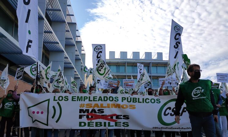 Miembros del sindicato CSIF se han concentrado este viernes ante las puertas de las consejerías de la Calle Morerías, en Mérida, por el "hartazgo" de los empleados públicos debido a la pérdida de poder adquisitivo y los recortes.