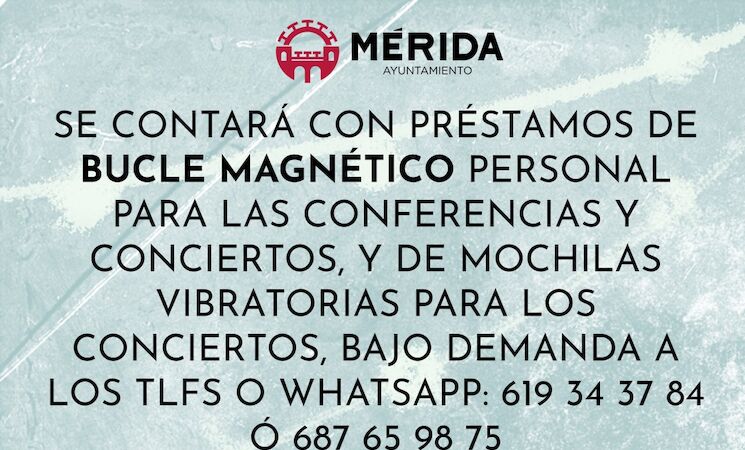 Además, para los conciertos se pondrán a disposición, bajo demanda, mochilas vibratorias para todas las personas que lo necesiten, solicitándolos, tanto el bucle como la mochila, al teléfono o Whatssapp 619 343 784 y 687 659 875, según explica en una nota de prensa el Ayuntamiento de Mérida.