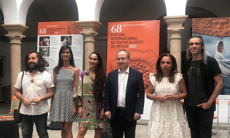 El próximo estreno del Festival Internacional de Teatro Clásico de Mérida ha sido presentado este lunes en rueda de prensa por Rafaela Carrasco, Álvaro Tato y Jesús Torres, junto al director del certamen, Jesús Cimarro; la secretaria general de Cultura, Miriam García Cabezas, y la delegada municipal de Cultura, Silvia Fernández.