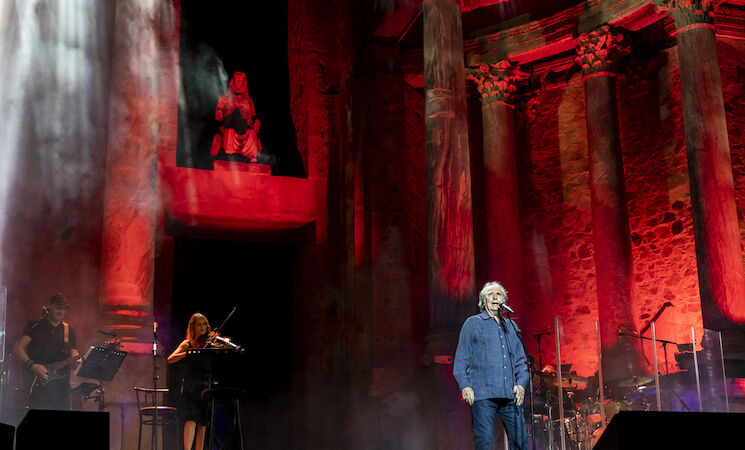 Una auténtica fiesta. Eso es lo que se ha vivido en la noche de este pasado domingo, 11 de septiembre, en el Teatro Romano de Mérida con la presencia sobre el escenario de Joan Manuel Serrat (Barcelona, 27 de diciembre de 1943) que ha gozado del abrazo y del cariño de un público entregado desde el primer acorde de la primera canción con la que ha abierto el concierto.