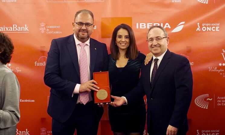 El alcalde de Mérida, Antonio Rodríguez Osuna, junto al director del Festival Internacional de Teatro Clásico de la ciudad, Jesús Cimarro, y la consejera de Cultura de la Junta de Extremadura, Nuria Flores, han recogido en Madrid la Medalla de Oro de la Academia de las Artes Escénicas al certamen emeritense.