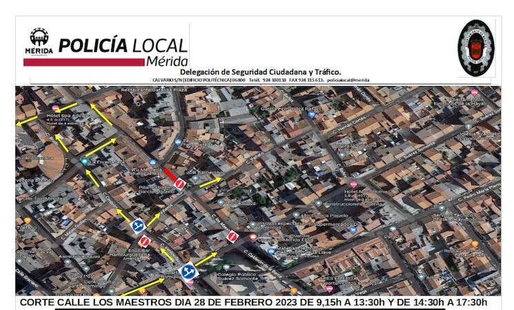 La calle Los Maestros en Mérida estará cortada al tráfico este martes, 28 de febrero, en horario de 9:15 a 13:30 horas y de 14:30 a 17:30 horas.