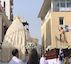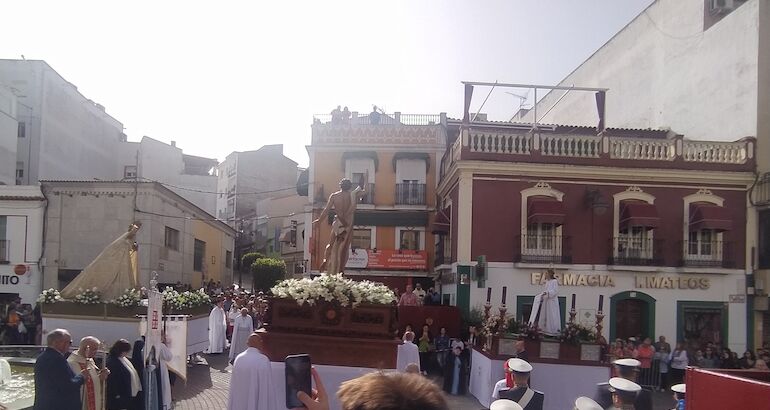El público ha aplaudido cada uno de los movimientos que los costaleros hicieron con las tres tallas, a los sones de la Banda de Cornetas y Tambores de la OJE de Mérida, alzándolos, acercándolos y danzándolos una y otra vez. Precisamente, cuando San Juan fue levantado, de sus manos se extendió una túnica blanca en la que iba bordado en letras rojas ‘Aleluya’.