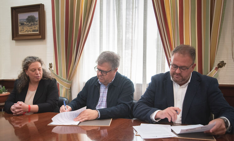 El Ayuntamiento de Mérida ha procedido este jueves a la cesión de una parcela de 2.500 m² a Plena Inclusión, por un periodo de 75 años, gracias a la firma de un acuerdo que ha sido rubricado por el alcalde, Antonio Rodríguez Osuna, y el tesorero de la entidad en la ciudad, José Ramón López Bardón.