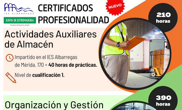 A su vez, en lo que respecta a los Certificados de Profesionalidad, uno de ellos será el de Actividades Auxiliares de Almacén con un nivel de cuantificación 1 y con 210 horas de las que 170 serán teóricas y 40 de prácticas, según informa el Ayuntamiento de Mérida en una nota de prensa.