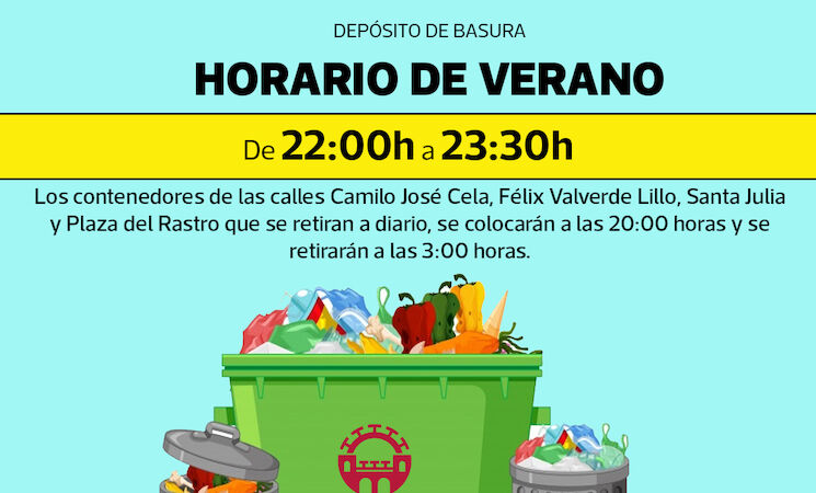 Así pues, la recogida de basuras se iniciará a las 00:00 horas de la noche, mientras que en el caso de los contenedores de las calles Camilo José Cela, Félix Valverde Lillo, Santa Julia y Plaza del Rastro que se retiran a diario, se colocarán a las 19:00 horas y se retirarán a las 3:00 horas de la madrugada.