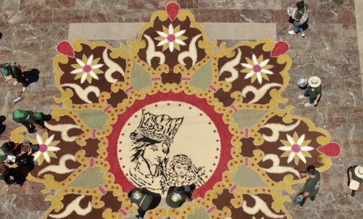 Asimismo, la imagen de Santa Eulalia está rodeada de un color pardo en alusión al color de la tierra de Mérida, y el fondo verde representa a Galicia, lugar de donde provienen los 19 alfombristas que realizarán la ofrenda floral, ha explicado la Asociación de Alfombristas Do Corpus Christi de Ponteareas en una nota de prensa.