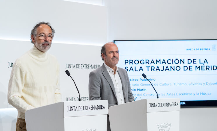 El secretario general de Cultura, Francisco Palomino, y el director del Centro de las Artes Escénicas y la Música de Extremadura (CEMART), Antonio Marín, han presentado la programación de la Sala Trajano para los próximos cinco meses.