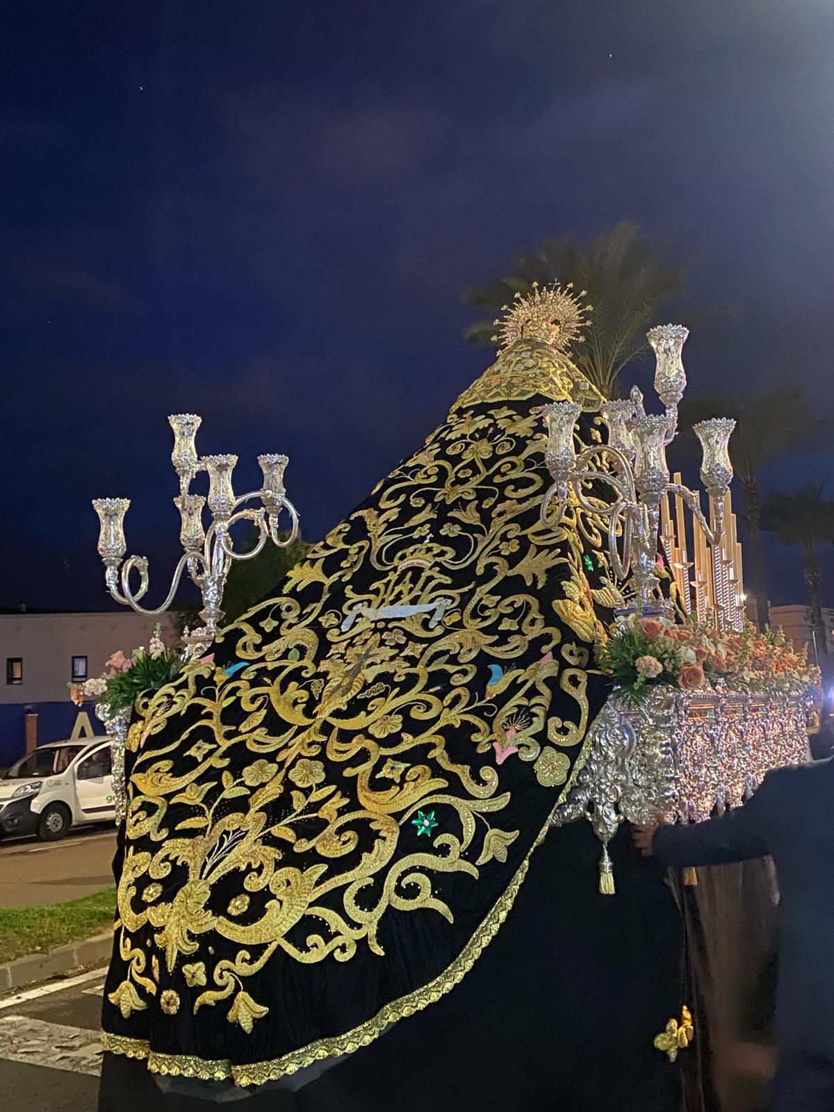 Así, pese al frío y la lluvia intermitente, sus dos tallas titulares llegaron antes hasta el Hornito, donde costaleras y costaleros lucieron ante la Mártir; y pasaron por el bulevard de las calles Camilo José Cela y Félix Valverde Lillo.
