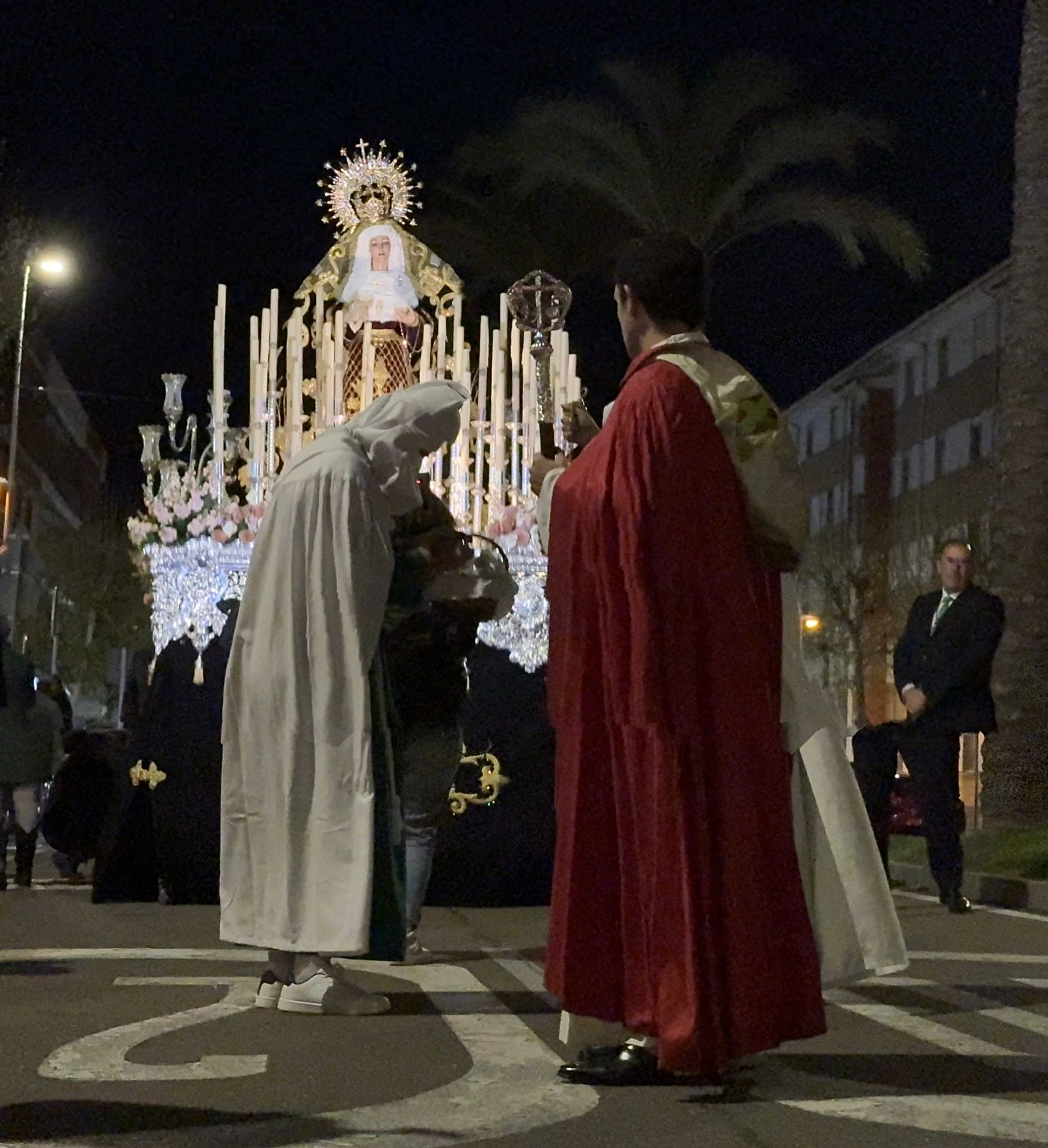Fue en el túnel que une la Avenida Juan Carlos I con la Avenida de Extremadura, donde sus tallas titulares se resguardaron del chaparrón de lluvia que cayó sobre la capital extremeña a partir de las 21:00 horas. Tras más de media hora en el mismo, la hermandad decidió continuar hacia la Plaza de España y llegar, de este modo, a la Carrera Oficial, donde hizo las delicias del público congregado a las puertas de la Concatedral de Santa María.