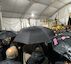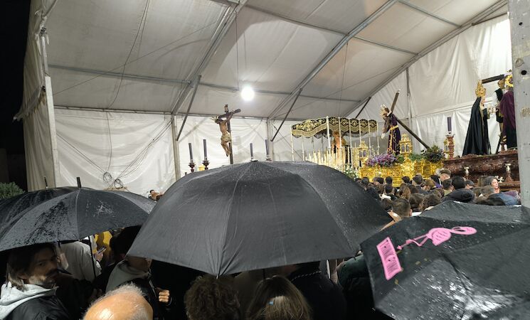 Cofrades, penitentes, costaleros y nazarenos, con paragua en mano, después de hacer unas oraciones presenciaban un momento único: los costaleros decidían hacer una pequeña levantá del Nazareno y lo mecían al ritmo de los sones de CC y TT de la OJE; después se unieron los costaleros de Nuestra Señora del Mayor Dolor.