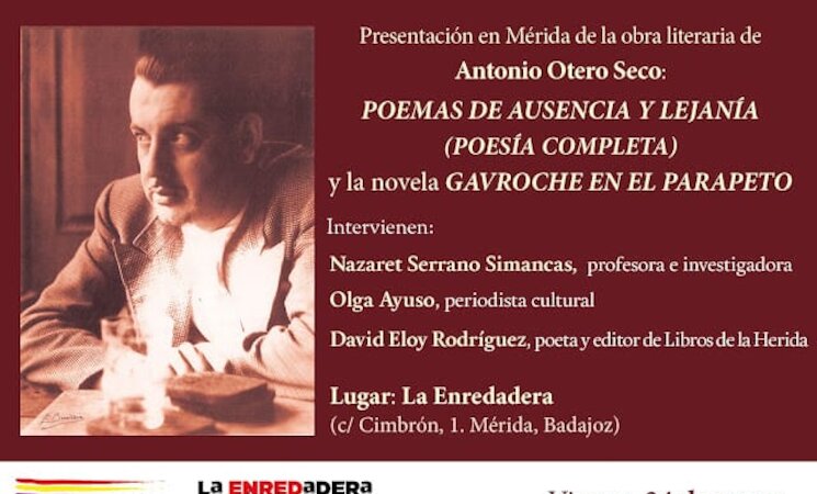 Este viernes, 24 de mayo, a las 20h, en La Enredadera, se presenta el trabajo, siendo un acto de reconocimiento a la obra y figura de Antonio Otero Seco (1905-1970) escritor y crítico literario, nacido en Cabeza del Buey (Badajoz) y muerto en el exilio en Rennes (Francia). Se trata de un personaje extremeño relevante en el contexto de la República y la guerra civil.