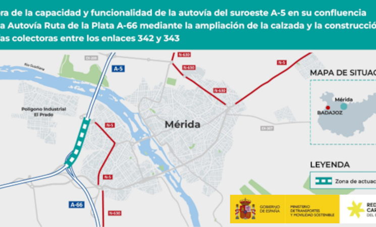 El Ministerio de Transportes y Movilidad Sostenible ha adjudicado por 602.279 euros (IVA incluido) la redacción del proyecto de trazado y construcción para la mejora de la capacidad y funcionalidad de la Autovía del Suroeste A-5 en su confluencia con la Autovía Ruta de la Plata A-66, mediante la ampliación de calzada y la construcción de vías colectoras, a su paso por Mérida.