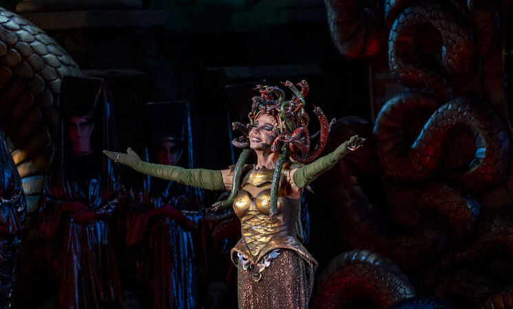 La escenografía, que firma Mónica Boromello, integra grandes figuras de serpientes para representar la cueva de medusa y un gran oráculo en el que se proyectan imágenes que acompañan el espectáculo, en el que destaca el vestuario de Pier Paolo Álvaro.