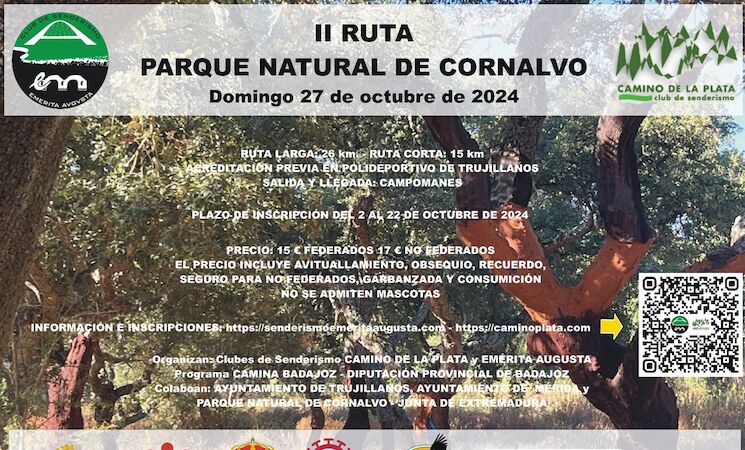Los clubes de senderismo Camino de la Plata y Emérita Augusta organizan la II Ruta Parque Natural de Cornalvo, que se celebrará el próximo domingo 27 de octubre y contará con dos recorridos, uno de 26 kilómetros y otro de 15.