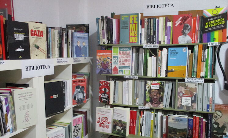 Se trata de una biblioteca con más de 1.000 libros sobre temáticas variadas, como ensayo, historia, debate político, educación libre y pedagogía, psicología y salud mental, filosofía, sexualidad, feminismo, LGTB, ecología y temas rurales, tecnología, y temas extremeños de interés, entre otros.