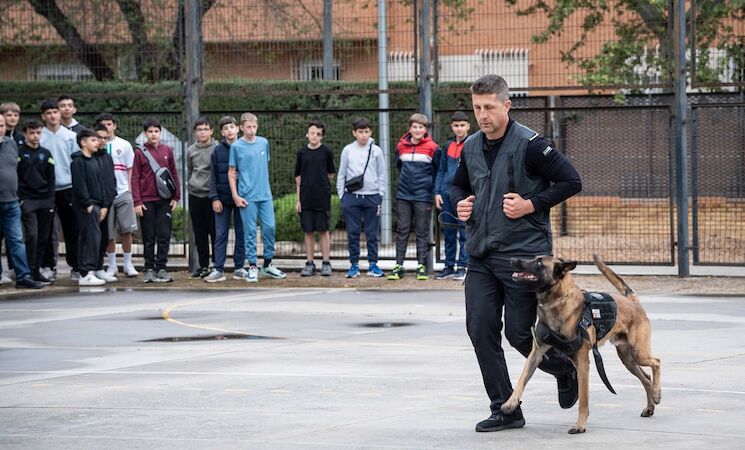 La unidad canina de la Policía Local de Mérida se exhibe en el IES Emérita Augusta