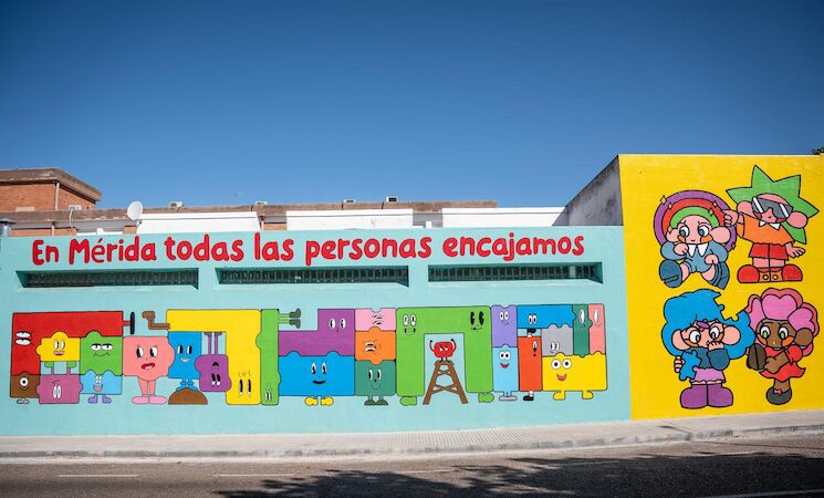 El alcalde de Mérida, Antonio Rodríguez Osuna, acompañado por la delegada de Formación para el Empleo, Pilar Amor, ha participado, en la inauguración del mural 'En Mérida todas las personas encajamos', pintado en la fachada del CEE Emérita Augusta.