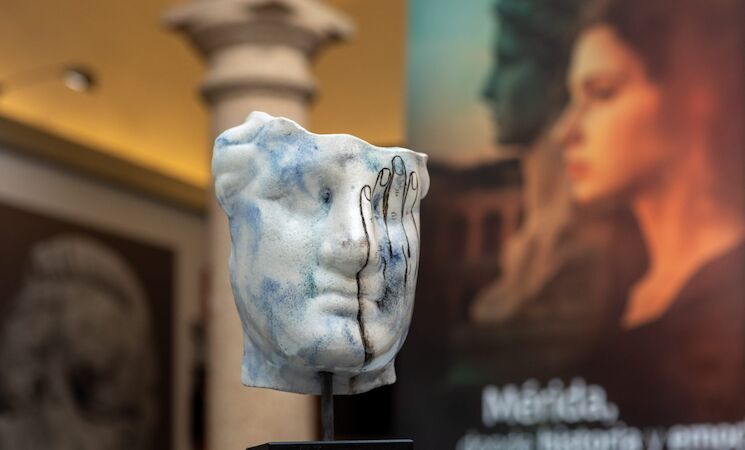 El estudio Terracota Mérida ha presentado la pieza, elaborada por Juan Manuel Pérez Vinagre y Samuel Lópe-Lago que, como todos los años, está inspirada en el lema de este año ‘Mérida, donde historia y emoción se encuentran’, y que se caracteriza por la mano que tapa uno de los ojos.