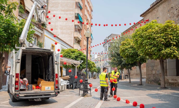 El Ayuntamiento de Mérida ha comenzado la instalación de casi 9.000 farolillos rojos, a través de la empresa extremeña Henry Iluminaciones, en lugares emblemáticos del centro histórico, como la Plaza de España, las calles Berzocana, Santa Eulalia-Puerta de la Villa y Félix Valverde Lillo, así como los alrededores del Arco de Trajano y el recinto ferial, con motivo de la Feria.