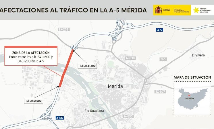El Ministerio de Transportes y Movilidad Sostenible está ejecutando las obras de sustitución de las juntas de dilatación de los viaductos sobre el río Guadiana en el kilómetro 342,500 de la A-5 en Mérida, en la provincia de Badajoz, y provocarán el corte de la calzada derecha en varios kilómetros.