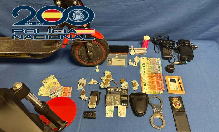 En la actuación los agentes intervinieron dos patinetes eléctricos, tres gramos de cocaína, cuatro gramos de hachís, una cartera con el emblema de la Policía Nacional y una placa emblema, sin número de carnet profesional en su interior, además de diversos teléfonos móviles.